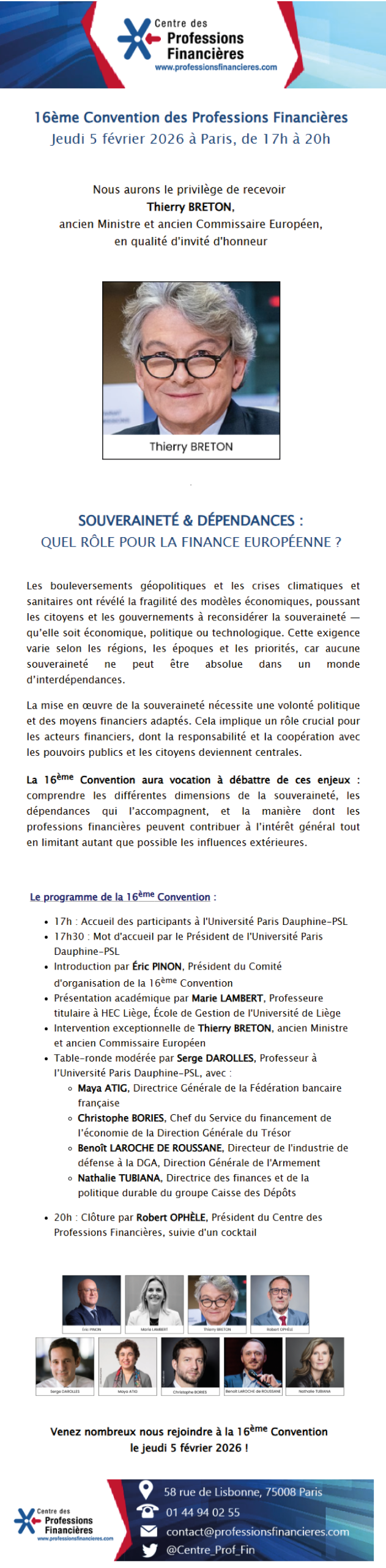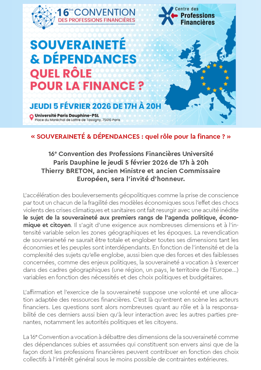 Événements 16e Convention des Professions Financières Jeudi 5 février 2026 Publié le : 08/01/2026 Programme et inscription