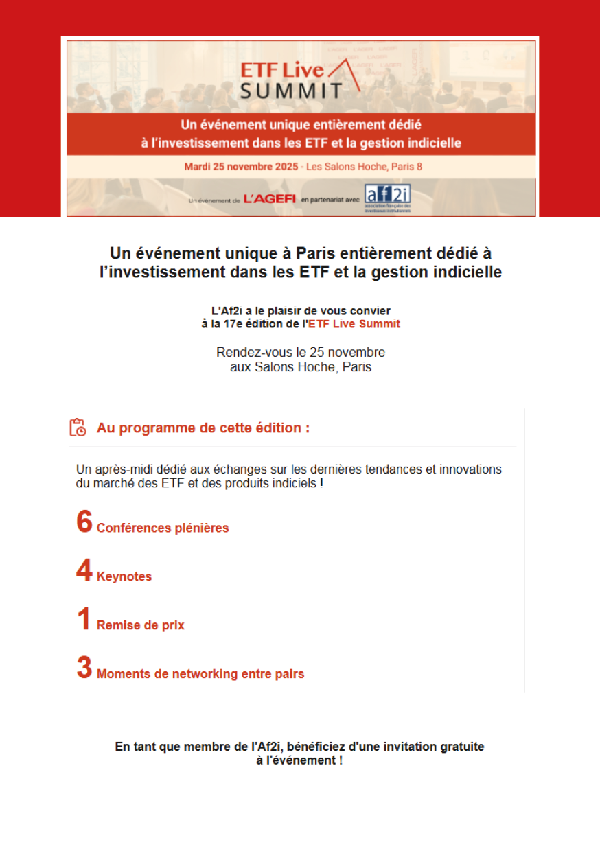 Événements ETF Live Summit Mardi 25 novembre Publié le : 06/11/2025 Découvrir le programme Je réserve ma place